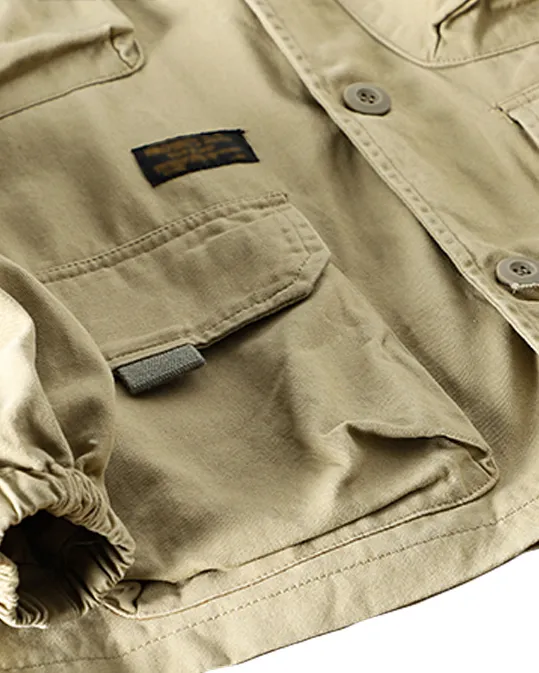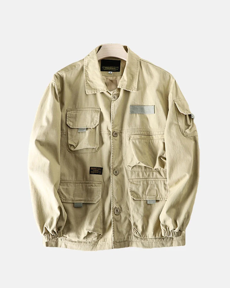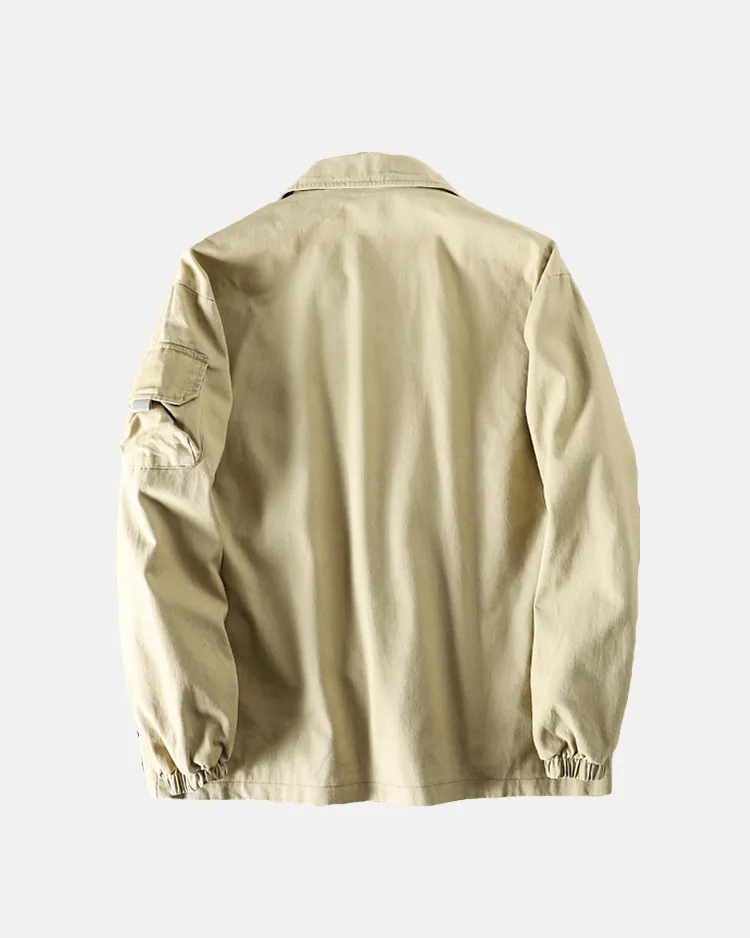 Functional details include a piped chest pocket, a flap chest pocket, two bottom flap pockets, a sleeve pocket, and woven tape accents. Elastic tape at the sleeve cuffs adds subtle structure and comfort. A timeless outerwear piece with strong character and utility.